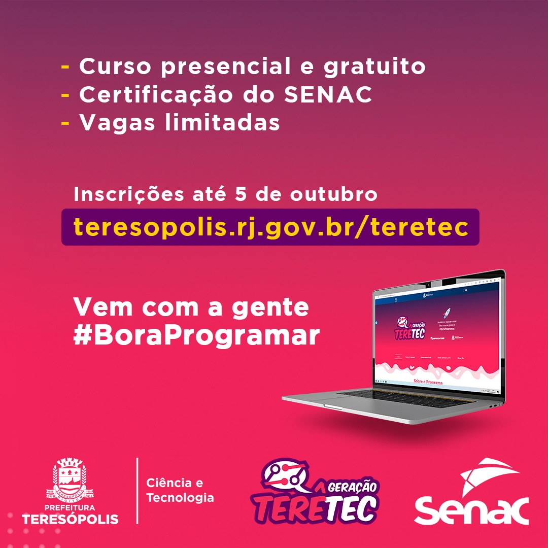 Os cursos oferecidos no programa de formação profissional tecnológica ‘Geração TerêTec’ possibilitam ao aluno a construção personalizada de seu projeto educativo e de vida. Em formato inédito, o programa funciona como um hub de aprendizado em profissões digitais e tem como objetivo capacitar e formar jovens para o mercado de trabalho, com foco na empregabilidade e na geração de renda. Para saber mais sobre o programa, acesse: www.teresopolis.rj.gov.br/teretec.
