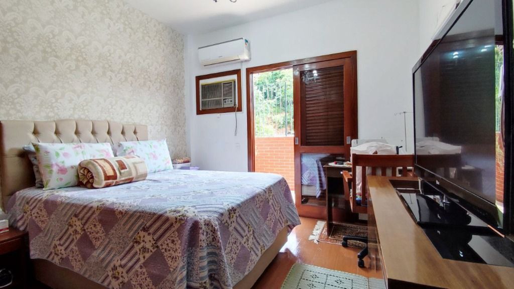 Composta por sala em 3 ambientes um deles com lareira, varandão em volta de toda propriedade com linda vista, 4 quartos sendo 1 suíte ampla e banheiro com 2 lavatórios, todos os quartos com acesso à varanda com vista livre, cozinha e lavanderia, dependência e banheiro de empregada 2 banheiros social e um lavabo (total de 5 banheiros), formam as características principais do imóvel.