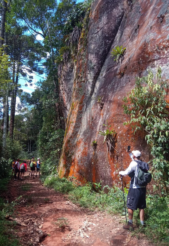O trecho inicial é em paralelo, que aos poucos vai se perdendo em meio às pedras e terra batida, consequência do pouco investimento em calçamento e danos causados pelas fortes chuvas e tragédias naturais dos últimos anos. Mesmo onde ainda há moradias, muitas grandes Araucárias e outras espécies vegetais deixam a subida amena e já com indicativo que a fauna é rica por ali. Em certo momento, um grande afloramento rochoso tomado por liquens alaranjados é um convite à contemplação e registros fotográficos.