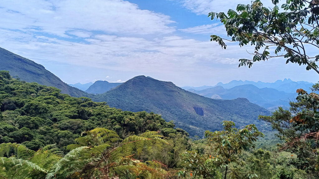 Que visual! Em primeiro plano, as formações protegidas pelo Parque Natural Municipal Montanhas de Teresópolis. Ao fundo, os Três Picos. Foto: Mochileiro/Marcello Medeiros