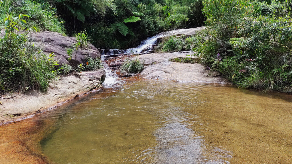 Trilha tem alguns pontos que cruzam pequenos rios, como esse que vai levar a uma bonita cascata. Foto: Mochileiro/Marcello Medeiros