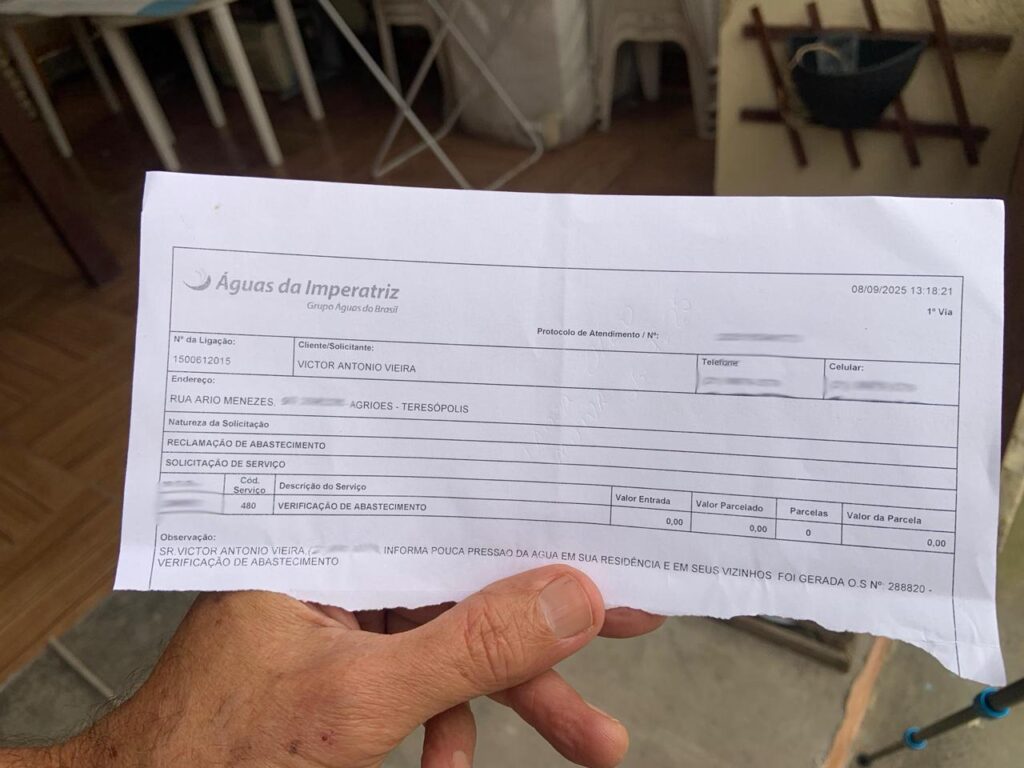 Diante dos transtornos, o morador da Rua Ario Menezes recorreu a concessionária responsável pelo fornecimento de água, a Águas da Imperatriz, três vezes, não recebendo soluções. “Até agora nenhuma sugestão ou solução deles foi apresentada. Da última vez que eu fui reclamar, me entregaram um protocolo dizendo que viriam aqui, mas já vai completar 30 dias, sem nenhum retorno”, contou Victor, que também destacou que na primeira notificação à concessionária um funcionário realizou a medição da pressão junto ao hidrômetro. “Ele alegou que a pressão estava dentro da média. Só que essa pressão não é suficiente para chegar aqui na caixa. Precisamos da água o dia todo, não só um terço dele”, concluiu.