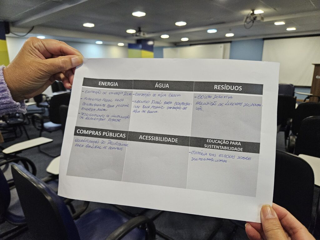 Ainda segundo o edil, com a participação na oficina, os conceitos aprendidos serão aplicados em seus mandatos, criando uma Câmara Municipal cada vez mais eficiente e transparente, trazendo benefícios para a consciência da população. “A partir do momento que conseguimos criar a ideia de sustentabilidade dentro da própria casa legislativa, nós vamos também estar passando um recado para as pessoas, podendo render campanhas de conscientização para ter uma cidade sustentável, mas primeiro dando o nosso exemplo”, concluiu Diego, ressaltando ainda a importância desta capacitação para a elaboração de um plano de sustentabilidade no município.