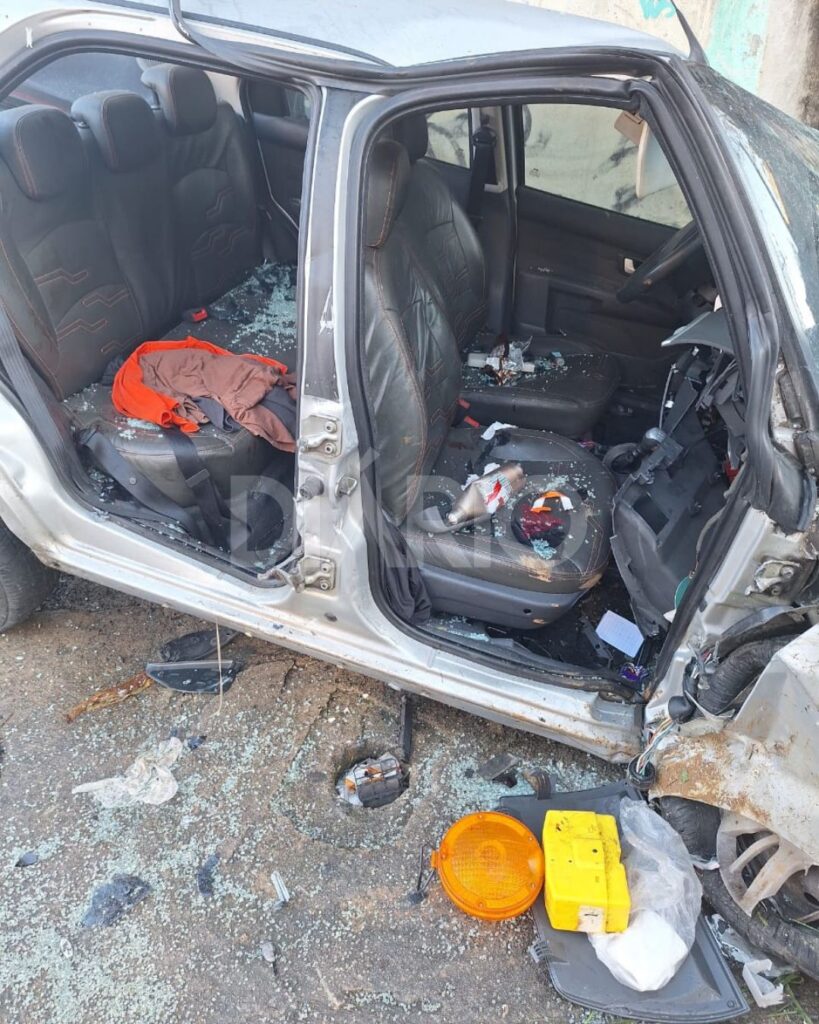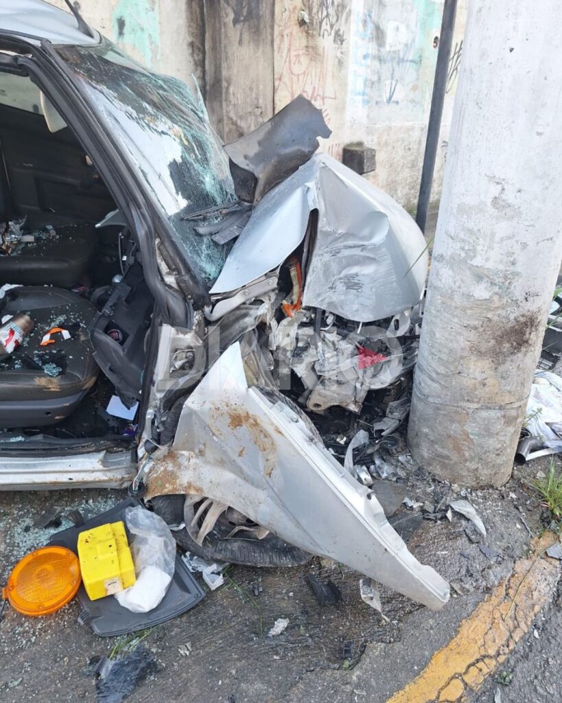 Imagens feitas após o acidente mostram o carro totalmente destruído, evidenciando a força do impacto.