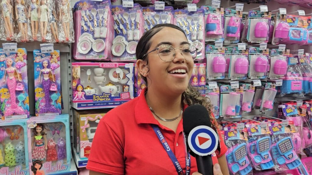 Se você ainda não garantiu o seu presente para Dia das Crianças, ainda dá tempo, como declara a vendedora da Casa & Lazer. “Até domingo vamos estar abertos. No dia 12, vamos funcionar das 9h às 17h”, convidou.