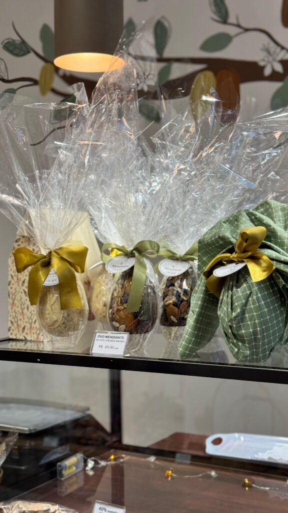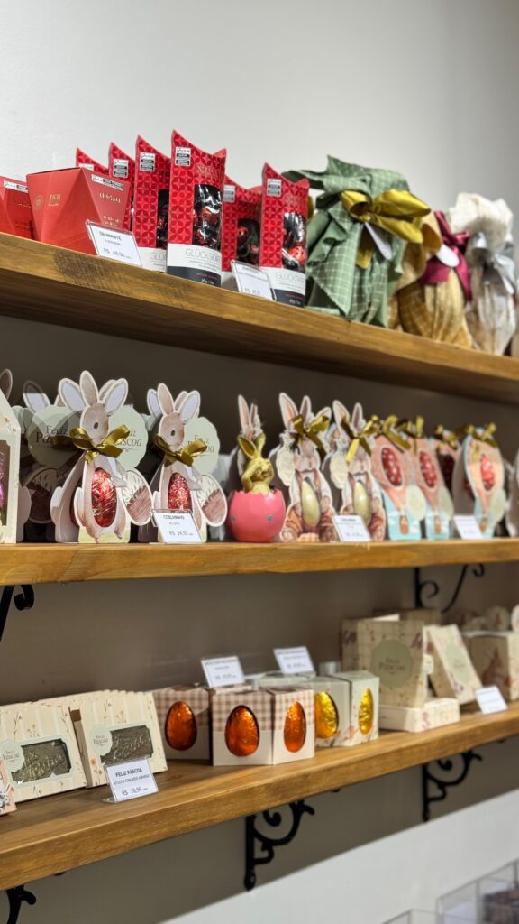 Para a Páscoa, a loja preparou diversas opções, como ovos artesanais, kits personalizados e lembranças especiais. Os clientes também podem montar combinações de acordo com o gosto, tornando o presente ainda mais único. Outro destaque é o fondue de chocolate servido na caneca, uma experiência diferenciada para quem visita o espaço.