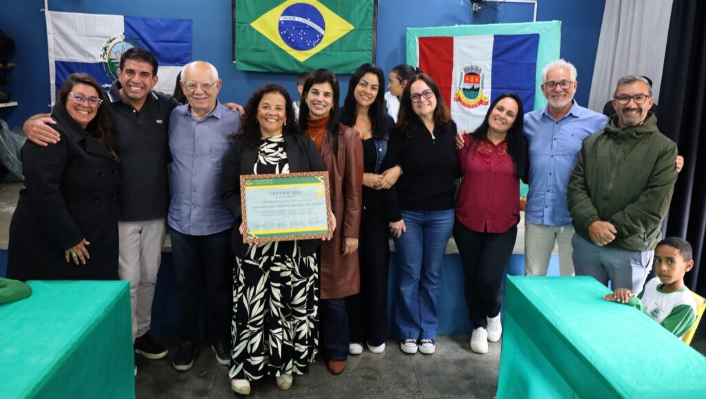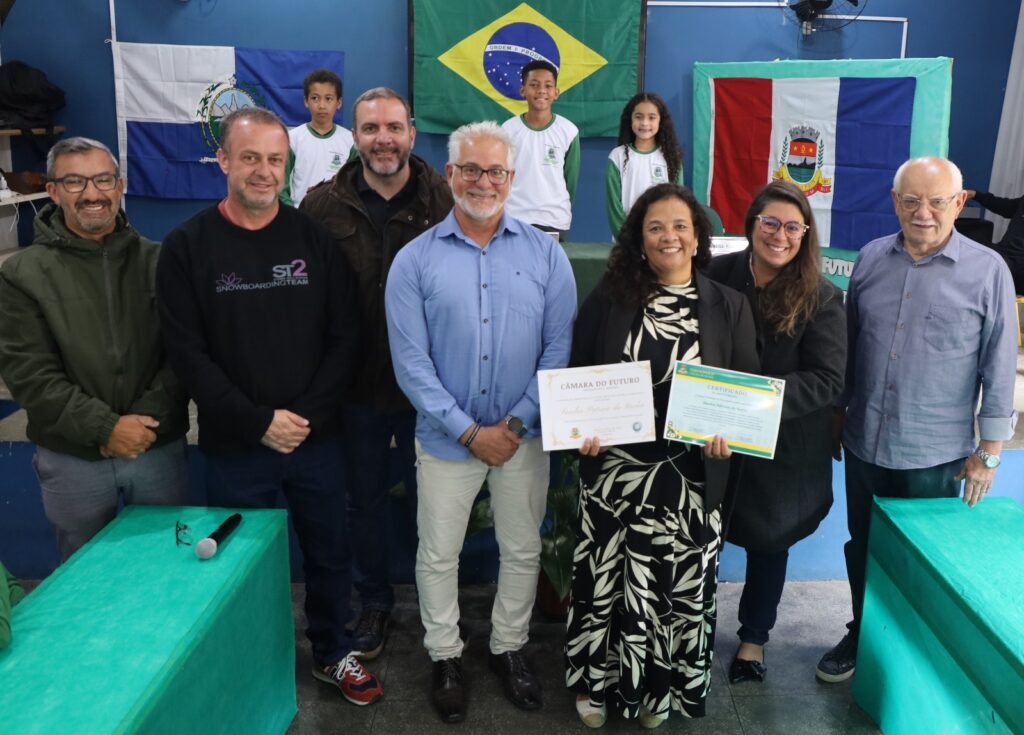 Sandra Patrício, diretora do Ciep, ao lado dos vereadores Dr. Amorim e Paulinho Nogueira, recebe certificado da Comissão Câmara do Futuro. Foto: AsComPMT