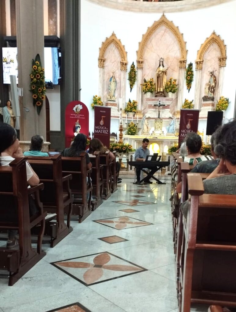 A Igreja de Santa Teresa recebeu o projeto Música na Matriz com o concerto do pianista e tecladista Bruno Fonseca. Passeando entre o popular e o clássico, o repertório apresentou obras de Tom Jobim, Cartola e Chico Buarque de Holanda, visitando mestres da música clássica, como Beethoven, Debussy e Heitor Villa-Lobos.