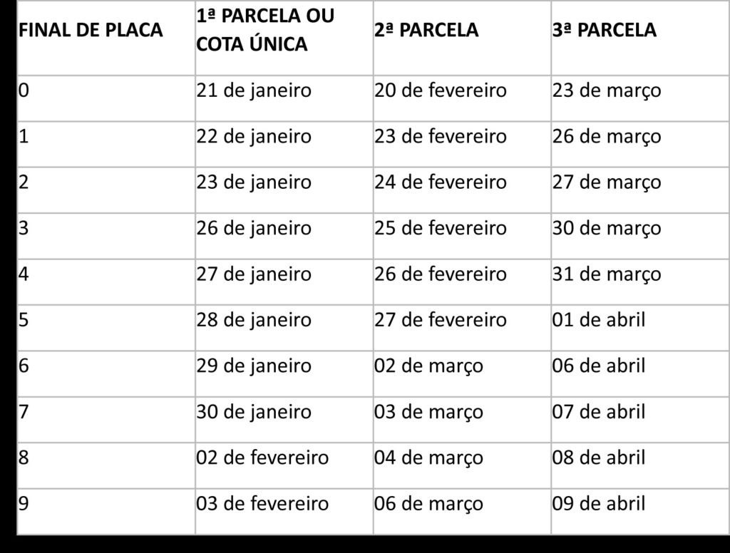 Ao acessar a plataforma, o contribuinte deverá informar o número do Registro Nacional de Veículos Automotores (Renavam). O documento pode ser quitado via Pix, em qualquer instituição financeira, ou por código de barras, em instituições parceiras da Fazenda Estadual (Bradesco, Itaú, Santander e SICOOB). Em 2026, o imposto vai incidir sobre cerca de 3,3 milhões de veículos. Ao emitir o DARJ, vale conferir se o CNPJ 42.498.675/0001-52 e o nome do favorecido “SEFAZ RJ – SECRETARIA DE ESTADO DE FAZENDA DO RJ” estão presentes no documento, evitando assim os golpes. Os vencimentos do IPVA 2026 começam a partir de 21 de janeiro e são divididos de acordo com o final da placa de cada veículo. O imposto poderá ser pago em cota única, com 3% de desconto, ou em até três parcelas, sem redução no valor.