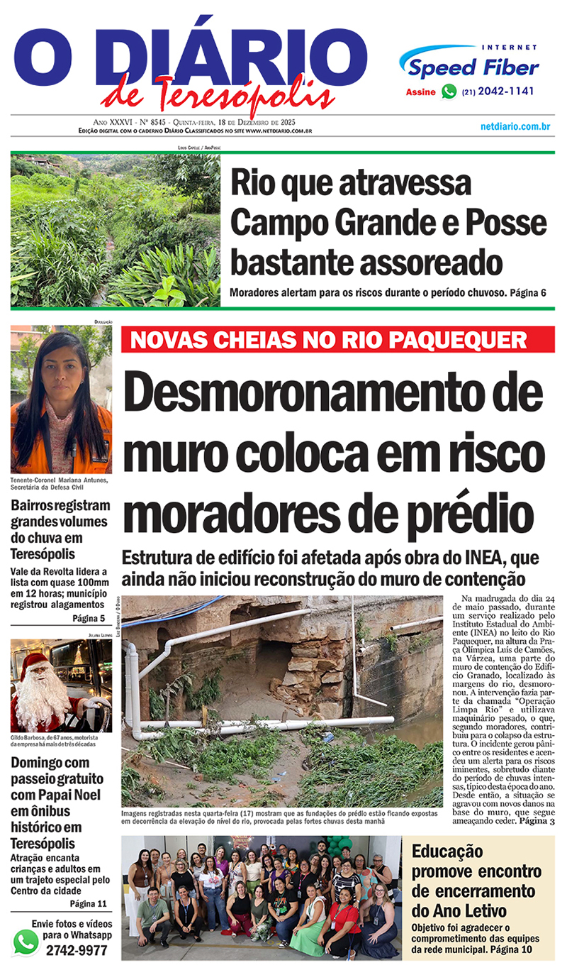 Como previsto em aviso meteorológico divulgado pela Defesa Civil de Teresópolis nesta terça-feira (16), em função da aproximação de uma frente fria e a formação de um sistema de baixa pressão próximo à costa da região Sudeste, associados ao calor e umidade disponíveis, pancadas de chuvas moderadas a fortes atingiram o município, principalmente durante a madrugada e manhã desta quarta-feira (17). Diante dos acumulados elevados de chuva, foram registradas quatro ocorrências, como informado em boletim enviado pela pasta responsável pelo monitoramento meteorológico. Na Rua Padre Tintório, na Várzea, houve a queda do muro de uma casa e outros três deslizamentos foram anotados: na Rua Pará (Barroso), na Rua Mato Grosso (Santa Cecília) e na Praça Olímpica (Várzea), sendo este último um local, às margens do Rio Paquequer, que desmoronou em maio deste ano e não recebeu as obras definitivas necessárias.