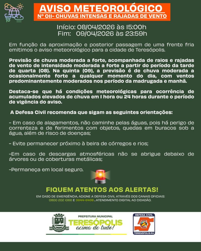A previsão de mudança no tempo volta a acender o sinal de alerta em Teresópolis. A chegada de uma frente fria deve alterar as condições climáticas no município nos próximos dias, com possibilidade de chuva de moderada a forte intensidade, acompanhada de rajadas de vento e descargas elétricas. Mesmo com o calor predominando durante o dia, a instabilidade ganha força a partir da tarde, cenário típico desse tipo de sistema meteorológico. Em cidades de Região Serrana como Teresópolis, esse tipo de mudança exige atenção redobrada, principalmente em áreas com histórico de deslizamentos ou alagamentos. A Defesa Civil informou que segue monitorando as condições do tempo em tempo real e mantém equipes de prontidão para atuar em qualquer eventualidade.