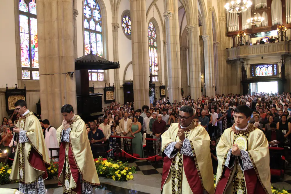 Na manhã do último sábado (06), a Catedral São Pedro de Alcântara, em Petrópolis, recebeu a celebração de ordenação sacerdotal, marcada por emoção, fé e esperança. Em solene missa presidida por Dom Joel Portella Amado, bispo diocesano, foram ordenados sacerdotes os diáconos Anderson Sales dos Santos Pereira, Cankin Ma Lam, Frederico Fernandes de Oliveira Ferreira e Yuri Araújo de Oliveira – morador de Teresópolis e que, neste domingo, celebrou sua primeira missa na Paróquia Coração de Jesus, na Barra do Imbuí.