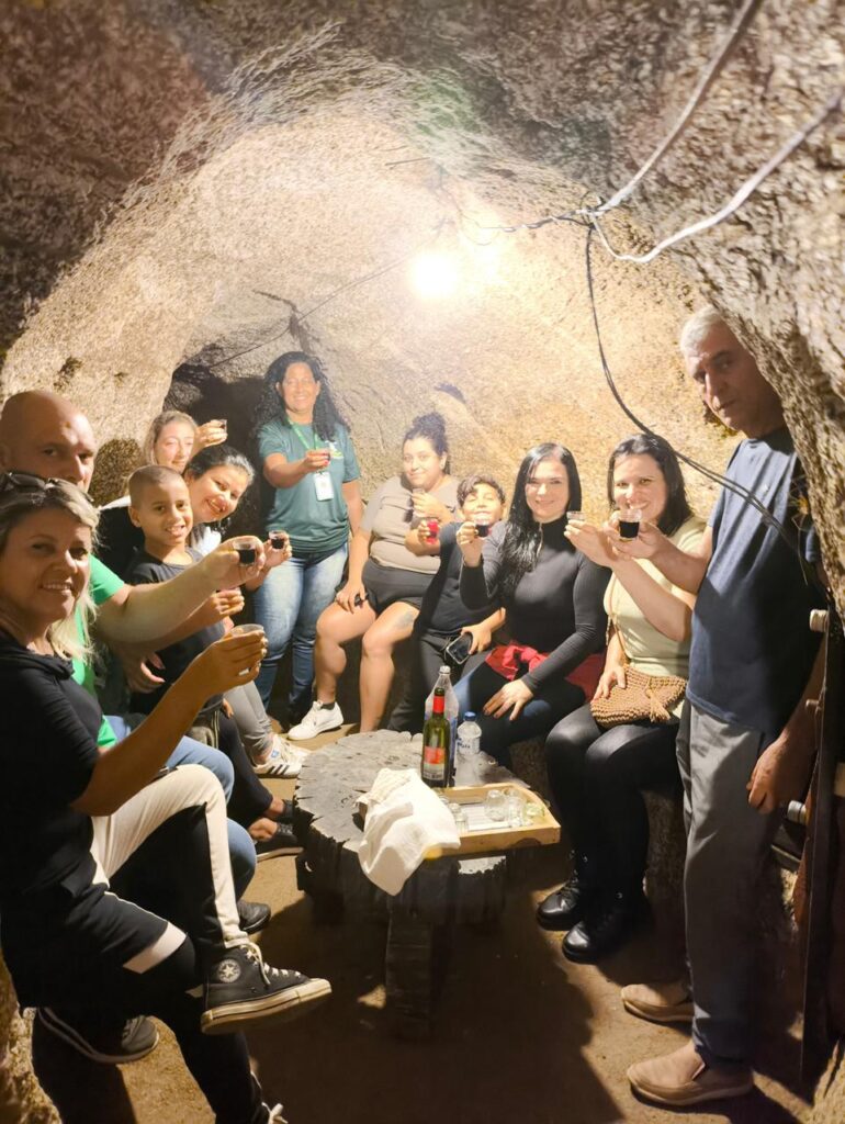 Um dos pontos altos do passeio foi a visita guiada à caverna do sítio, com mais de 80 anos de história. O trajeto até o local foi acompanhado de relatos sobre a origem da propriedade e curiosidades que atravessam gerações. Lá dentro, a experiência ganhou contornos ainda mais especiais: sentados na própria caverna, os participantes puderam brindar, conversar e simplesmente apreciar o momento.