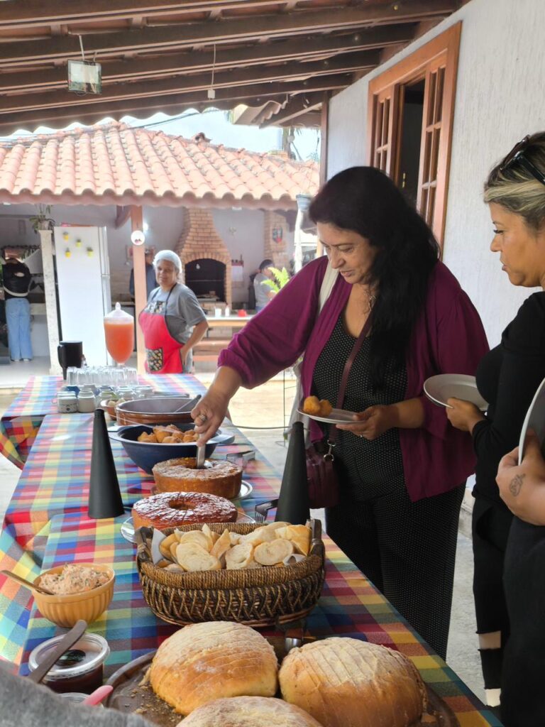 A idealizadora e proprietária do sítio, Ana Maria Barbosa, fez questão de receber pessoalmente cada visitante. Entre histórias sobre a produção dos morangos e o carinho dedicado à terra, ela também preparou o café da manhã típico rural, servido com milho, aipim, bolo de milho, geleias artesanais produzidas no local e café passado na hora.