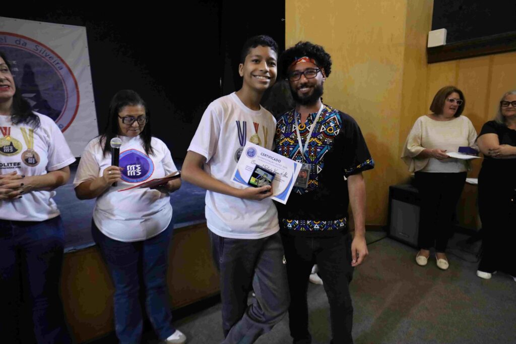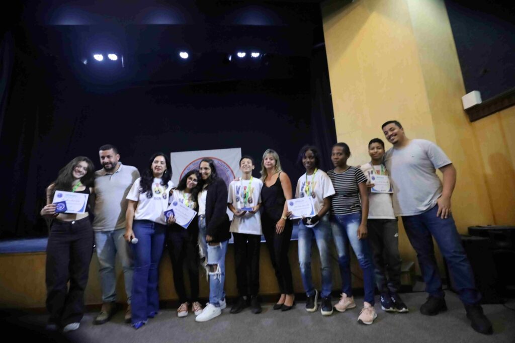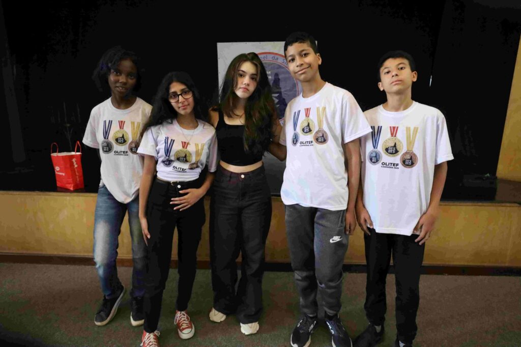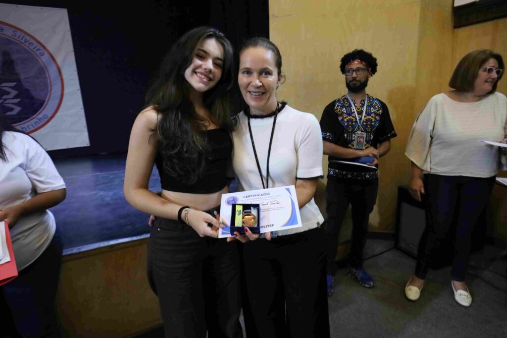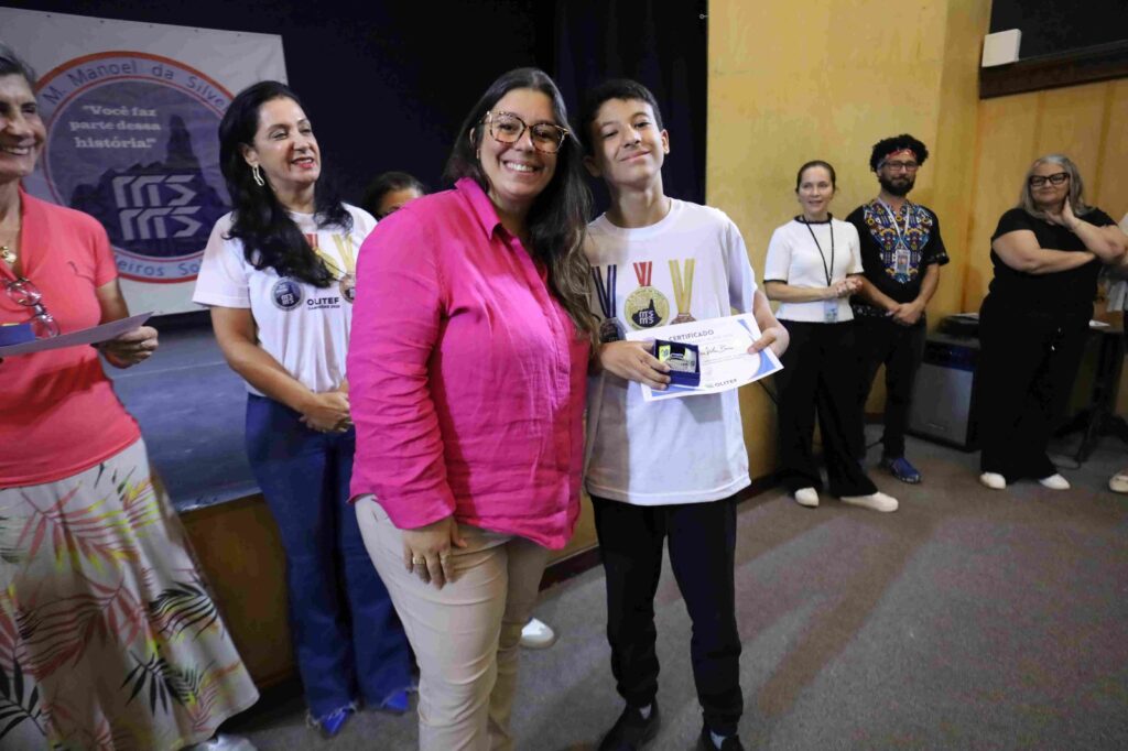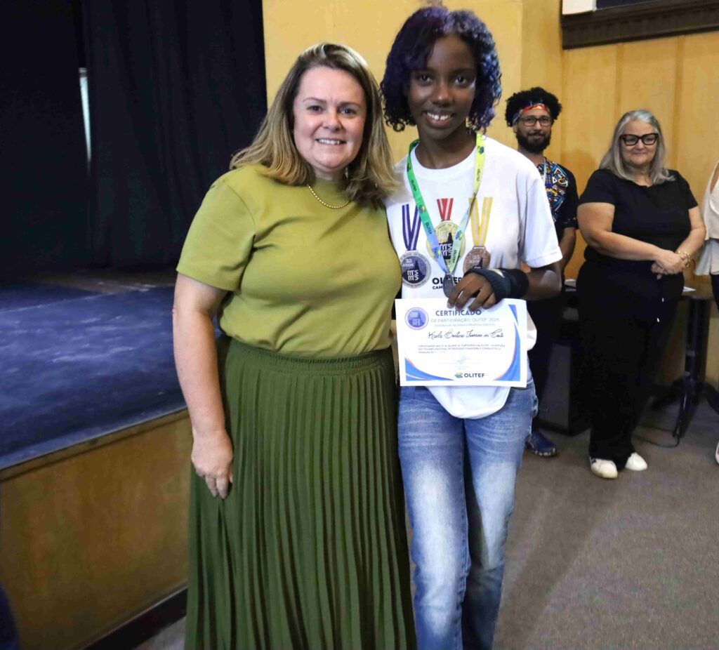 A diretora da escola, Cristina Rocha, comentou sobre o orgulho de participar de um momento tão especial. “Com grande orgulho que hoje nós estamos aqui para entregar as medalhas da OLITEF 2025 para os nossos alunos. Foram mais de 3 mil escolas inscritas, mais de 1,7 milhão de estudantes, com 3% que foram medalhistas, entre eles, cinco dos nossos queridos e dedicados alunos!”. Cristina também agradeceu a equipe da escola e os professores Leandro de Lima, Thiago Araújo, Flávio Lopes e Patrícia Carvalho, que coordenaram a participação na OLITEF.
