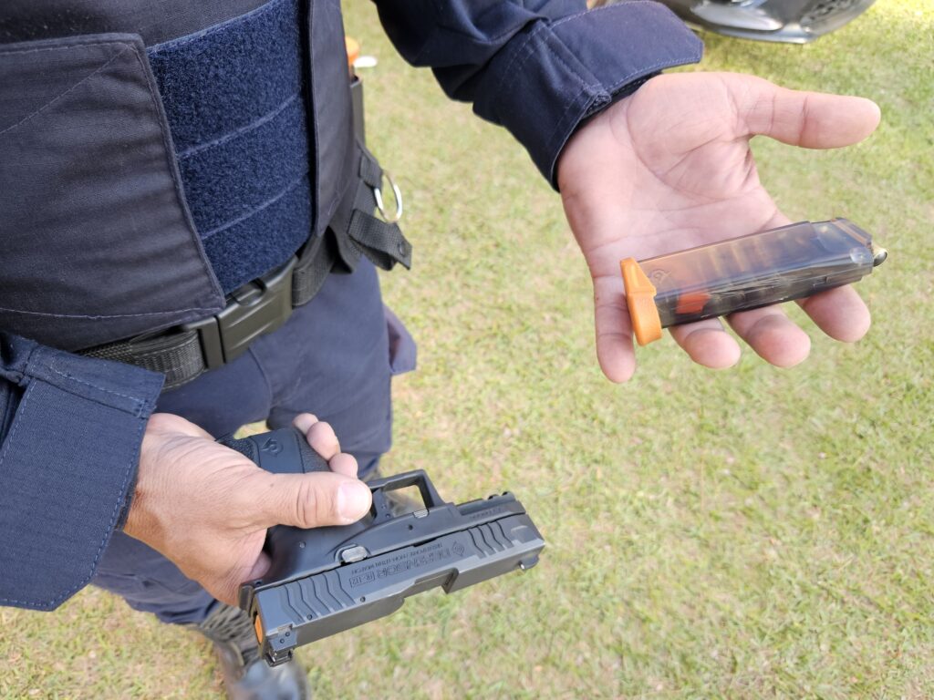 Sobre o armamento menos letal, a pistola utilizada é da marca Condor, com carregador para 12 munições de elastômero. O uso segue protocolo específico: o disparo deve ocorrer a mais de cinco metros de distância do agressor e direcionado aos membros inferiores, para evitar danos graves ou letalidade. “O objetivo é justamente reduzir ao máximo qualquer risco de letalidade, mantendo a eficácia operacional. Essa pistola contribui muito para o trabalho da Guarda Municipal, aumentando a sensação de segurança tanto para o agente quanto para a pessoa abordada”, pontuou Luciano.