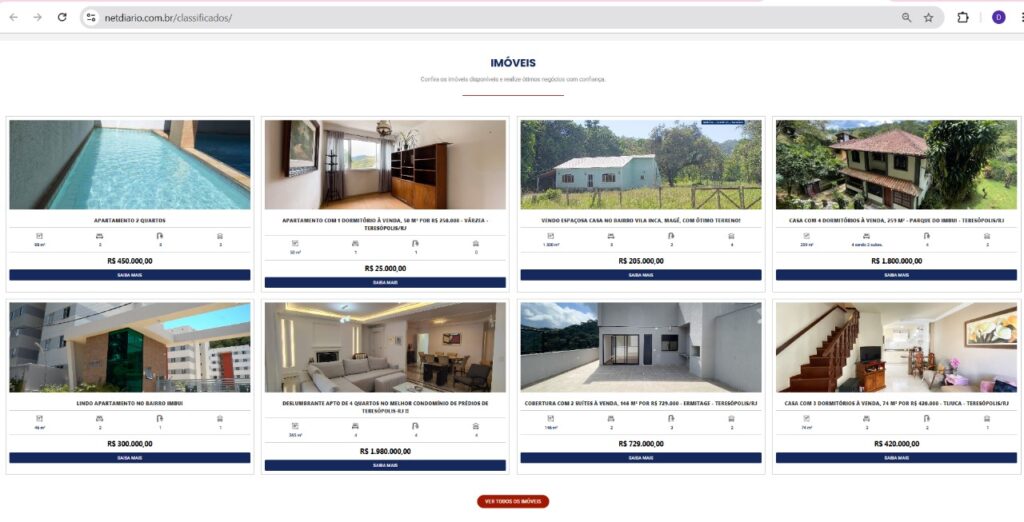 Novidade para quem procura imóvel em Teresópolis. O site NetDiário agora conta com a divulgação de anúncios de imobiliárias de Teresópolis e região com imóveis para venda e locação. Anuncie sua imobiliária nos Classificados do jornal O Diário de Teresópolis, enviei mensagem para o Whatsapp 21 2742-9977.