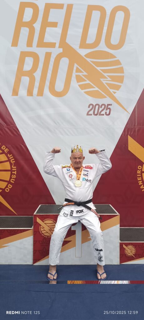 O ‘lendário’ lutador local Jessé Rodrigues, conhecido pelo apelido “O Poder”, se consagrou campeão na categoria Master 6, pesadíssimo, faixa-preta. Foto: Divulgação