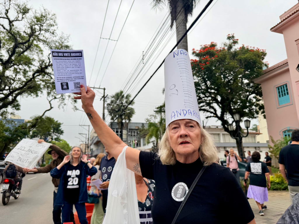 Foi realizado em frente ao Palácio Teresa Cristina, sede do governo municipal na Avenida Feliciano Sodré, na Várzea, mais um protesto contra a Lei 351/25 – a que prevê a liberação de prédios de até 60 metros de altura, ou seja, 20 andares, em determinada região do bairro Alto, em Teresópolis. Além de cartazes, faixas, panfletos e adesivos, os manifestantes passaram o abaixo-assinado que pede a revogação da lei. Uma maquete e até um chapéu simulando um ‘espigão’ foram utilizados pelos manifestantes.