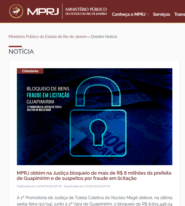 A 1ª Promotoria de Justiça de Tutela Coletiva do Núcleo Magé obteve, na última sexta-feira (10/04), junto à 2ª Vara de Guapimirim, o bloqueio de R$ 8.601.446,04 das contas da prefeita de Guapimirim, Marina Pereira da Rocha Fernandez, da empresa de medicina Speed Meg e de outras quatro pessoas, por suspeitas de fraudes em licitação. Segundo ação civil pública ajuizada pelo Ministério Público do Estado do Rio de Janeiro (MPRJ), a Prefeitura de Guapimirim celebrou contrato com a Speed Meg para a realização de exames na rede de saúde pública municipal, mediante direcionamento da licitação.