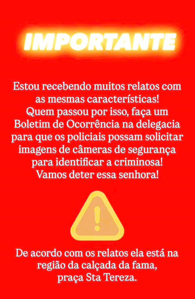 Nas mensagens, compartilhadas milhares de vezes, os autores afirmam receber “relatos de tentativa de sequestro de crianças no Centro da cidade”, descrevendo uma suposta “senhora loira que se aproximaria das mães para tentar puxar as crianças”. Em outro texto, a mulher teria sido vista atuando na região da Calçada da Fama e da Praça Santa Teresa. As publicações pedem atenção redobrada, recomendam acionar a polícia e solicitam que o conteúdo seja amplamente divulgado – apesar de não haver nenhuma comunicação oficial das forças de segurança sobre o assunto.