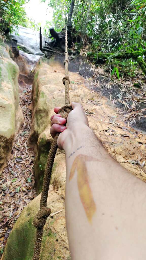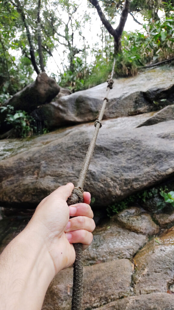 Há dois pontos íngremes, um barranco e um lajedo, onde é necessário utilizar cordas fixas – instaladas já há bastante tempo… Foto: Mochileiro – Marcello Medeiros