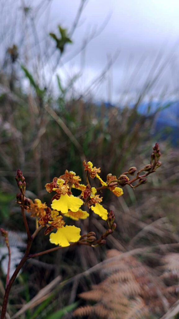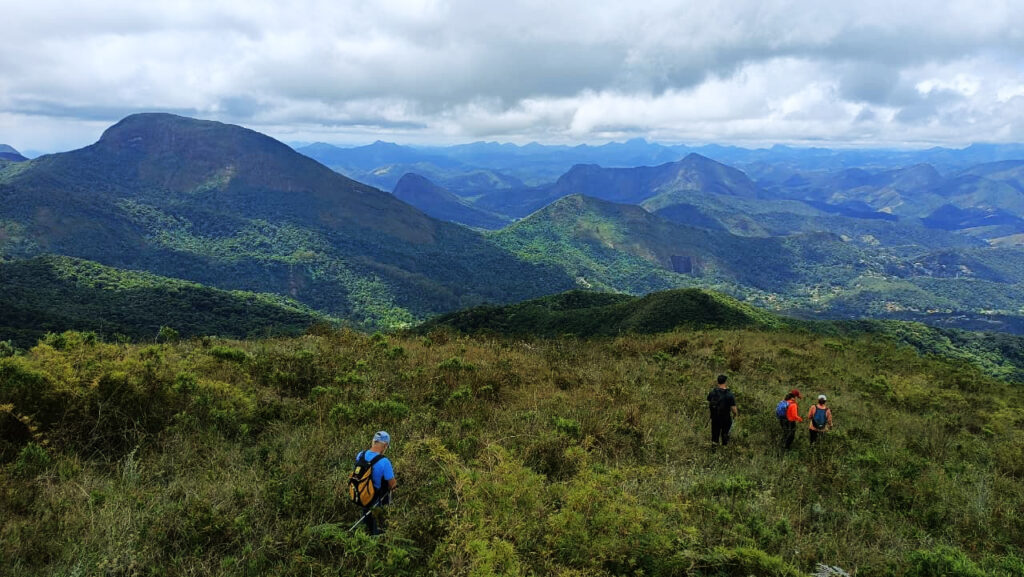 Mas os trechos mais íngremes são recompensados para o grande número de locais onde se contempla ao fundo o Parque Estadual dos Três Picos, com um bonito ângulo das montanhas que dão nome a essa unidade e para a Mulher de Pedra. Flores como orquídeas amarelas e (Oncidium aloha), muitas bromélias (Alcantarea imperialis) e líquens avermelhados (Cryptothecia rubrocincta) são outros ‘colírios’ para a vista de quem vive a essência do montanhismo.