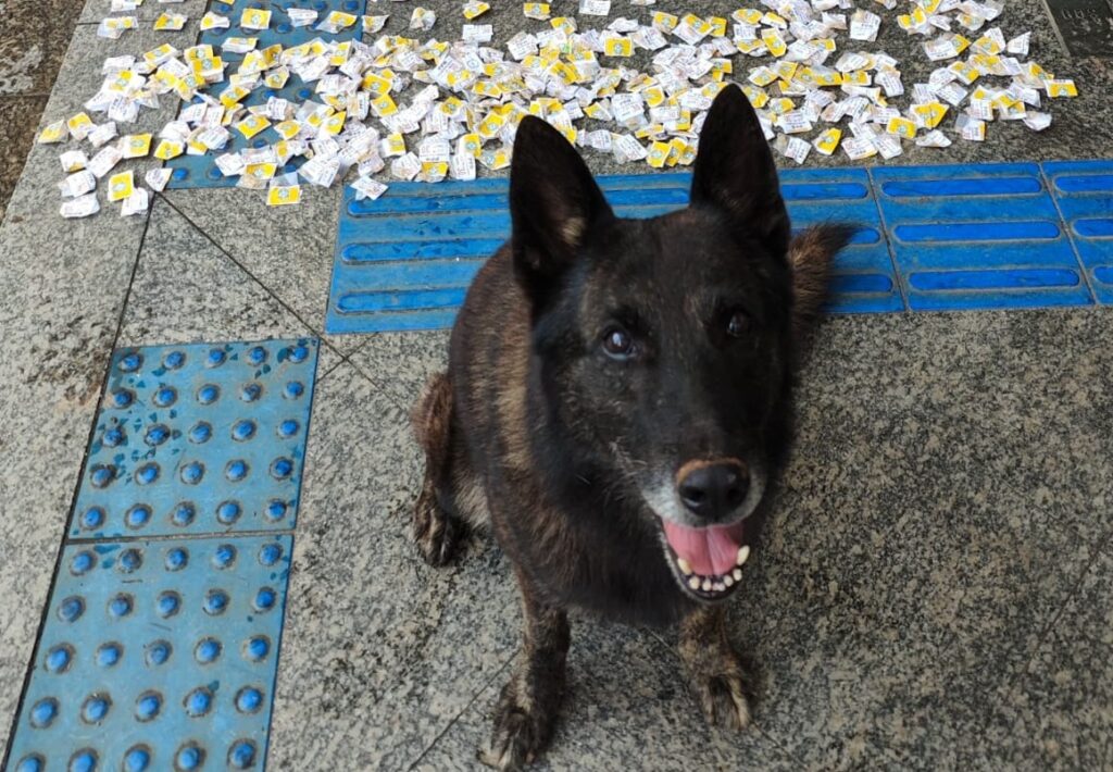 Já no período da tarde, uma nova ação foi realizada no bairro Perpétuo. A Polícia Militar, novamente com o apoio do cão farejador DJ, os policiais localizaram 819 pedras de crack, avaliadas em R$ 30 cada, totalizando R$ 24.570, além de 40 pinos de cocaína, estimados em R$ 600.