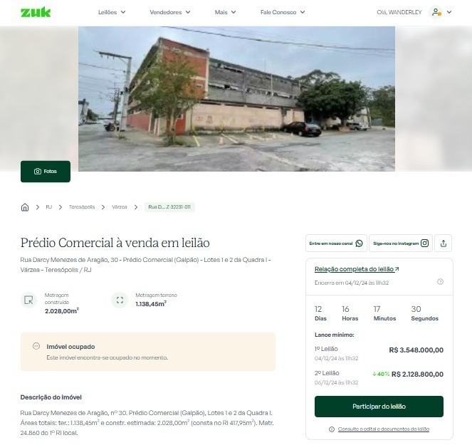 Anúncio de leilão do prédio adquirido pela Prefeitura de Teresópolis por 6,5 milhões de reais, durante o governo do ex-prefeito Vinicius Claussen