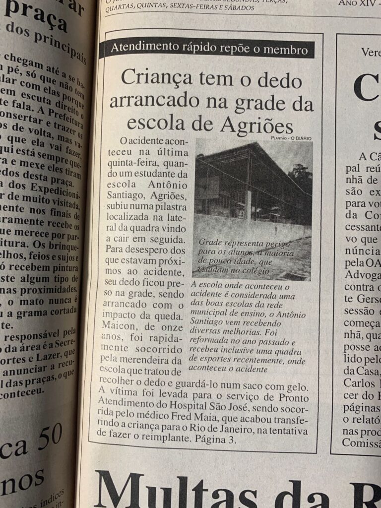 Eram 14h do dia 3 de dezembro de 1988, uma quinta-feira, quando o pequeno Maicon, de apenas 11 anos, foi vítima de um triste acidente na quadra de esportes. Tudo começou quando o menino subiu numa pilastra na lateral da quadra, perdendo o equilíbrio e caindo, depois de ter se agarrado a uma tela de arame. Para desespero dele e das outras crianças que estavam próximas, seu dedo ficou preso na grade, sendo arrancado com o impacto da queda. Maicon foi rapidamente socorrido pela merendeira da escola, que tratou de recolher o dedo e guardá-lo num saco com gelo. A vítima foi levada para o serviço de Pronto Atendimento do Hospital São José, sendo socorrida pelo saudoso médico Fred Maia, que prestou os primeiros socorros. Segundo relato publicado no DIÁRIO, “vendo que o hospital não tinha condições de fazer a cirurgia de reimplante, o médico solicitou à família a transferência de Maicon para o Rio de Janeiro. Numa corrida contra o tempo, a família iniciou uma série de contatos, oferecendo a Secretaria Municipal de Saúde o transporte para o Rio de Janeiro e o custeio da cirurgia. Após o reimplante, feito com sucesso através de uma microcirurgia na Clinica Particular Bambina, em Botafogo, o pequeno retornou para sua casa, no Meudon, onde está sendo cuidado pela família”. A cirurgia, no hospital do Rio de Janeiro, custou à época R$ 20 mil, segundo a matéria do jornal, valor corrigido aos dias de hoje em cerca de R$ 135 mil.