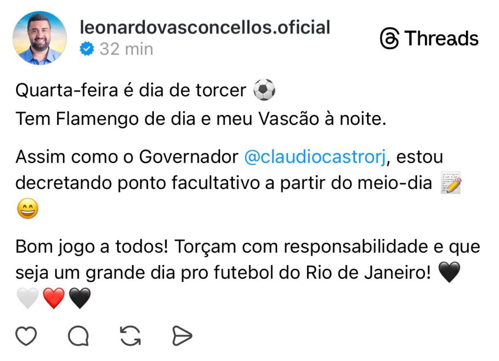 Na publicação, o prefeito destacou a importância do dia para o futebol carioca. “Quarta-feira é dia de torcer. Tem Flamengo de dia e meu Vascão à noite. Assim como o governador Cláudio Castro, estou decretando ponto facultativo a partir do meio-dia. Bom jogo a todos! Torçam com responsabilidade e que seja um grande dia pro futebol do Rio de Janeiro!”, escreveu. A medida não se aplica a serviços essenciais, que seguem funcionando normalmente.