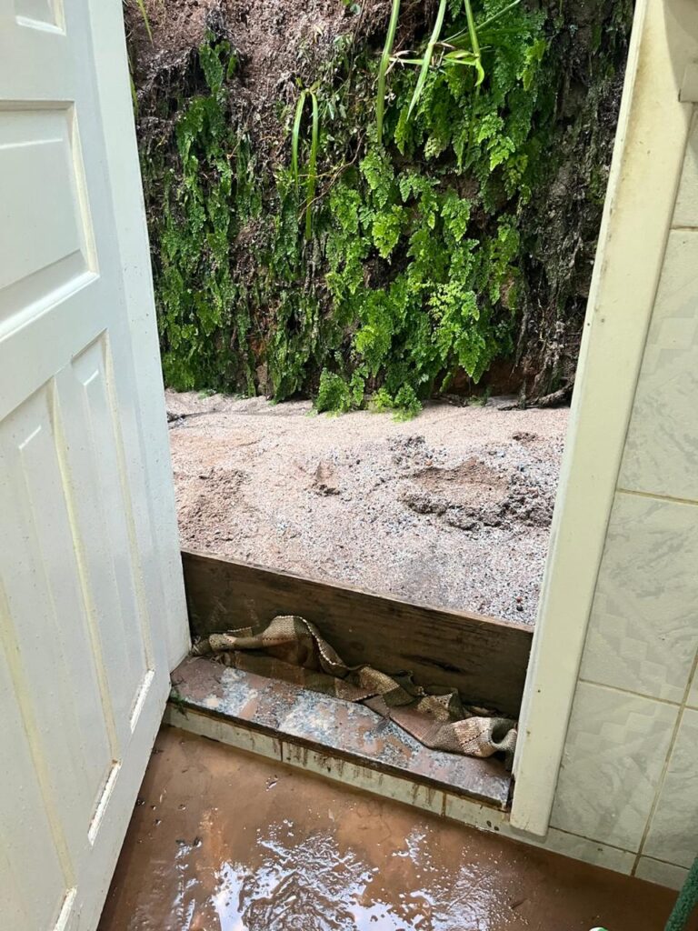 Álvaro tentou improvisar barreiras com pedaços de madeira e, junto com vizinhos, chegou a fazer desvios para conter o fluxo, mas sem sucesso. O resultado foi a perda de móveis, como um sofá, além de muita lama acumulada no interior da residência. Apesar dos danos materiais, ele ressalta que a estrutura da casa não foi comprometida. “Graças a Deus não foi estrutural, mas podia ter sido muito pior.”