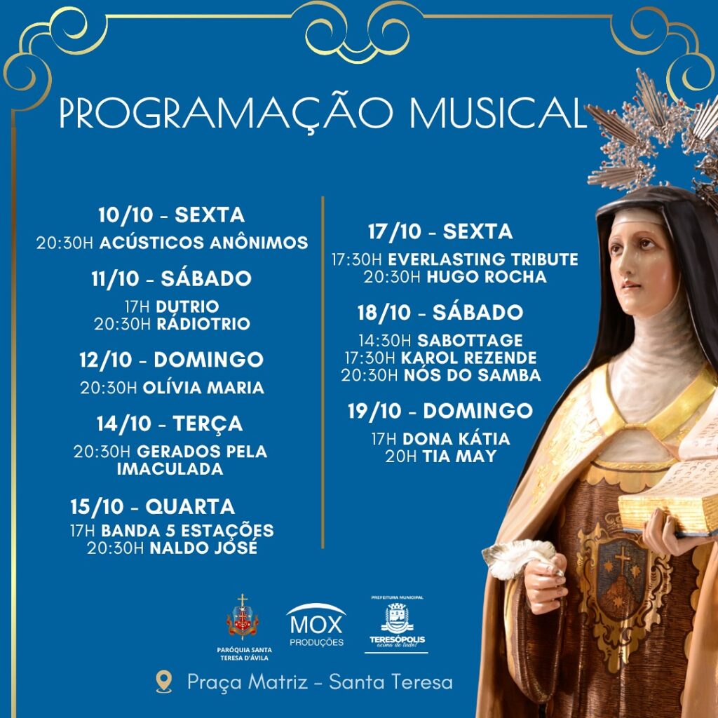 As celebrações em homenagem a uma das padroeiras de Teresópolis, Santa Teresa D’Ávila, já começaram e, na edição deste ano, fazem parte de uma programação especial e repleta de atrações. A agenda religiosa teve início nesta segunda-feira (06) e segue até o dia de sua homenagem, 15 de outubro. Entretanto, devido a uma parceria entre a Paróquia de Santa Teresa, a Mox Produções e a Prefeitura Municipal de Teresópolis, a festa se estende até o dia 19, prometendo movimentar a economia local e fortalecer o turismo religioso e cultural.