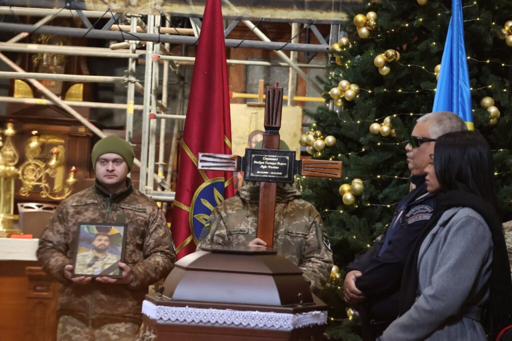 Acompanhado de familiares, o ‘Sargento Luís’ acompanhou as cerimônias de despedida do filho, sepultado como um herói ucraniano. Foto: Reprodução