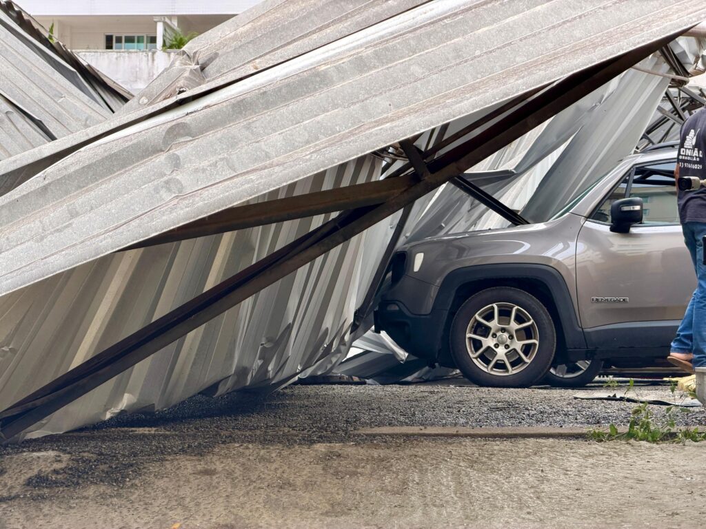 A Quarta-Feira de Cinzas começou como um típico dia de Verão. Muito calor, tempo abafado e… de repente uma forte chuva, que chegou acompanhada de um vendaval. E a ventania acabou causando mais prejuízos que a precipitação, arrancando telhados, derrubando árvores e retirando letreiros de lojas na região central do município. O maior problema ocorreu na Rua Carmela Dutra, em Agriões, onde o telhado de um estacionamento foi balançado pelo vendaval e cedeu parcialmente, com a estrutura tombando em direção ao pátio. Não havia ninguém no local e, apesar do grande prejuízo para o estabelecimento, apenas um dos veículos guardados no local foi mais afetado.