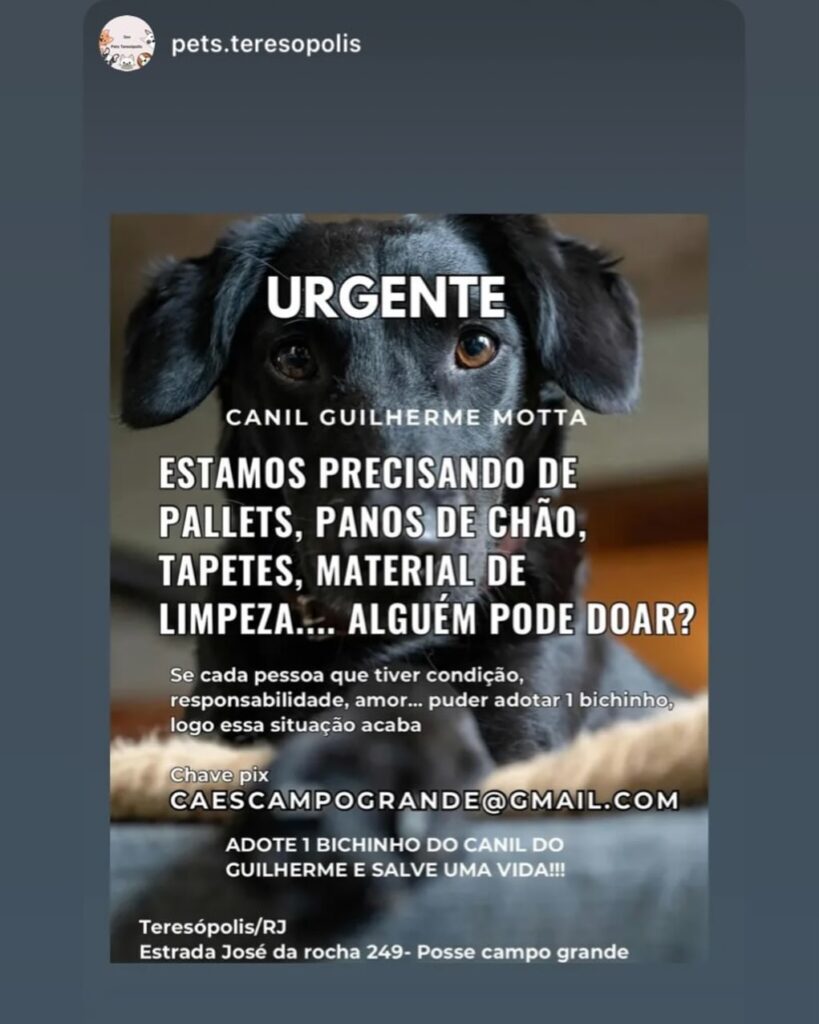 Os perfis @adoteumamor.teresopolis e @caescampogrande, no Instagram, concentram informações sobre adoções e atualizações do abrigo. Quem deseja colaborar financeiramente pode contribuir por meio da chave Pix (caescampogrande@gmail.com), destinada ao custeio do trabalho dos ajudantes que mantêm o local funcionando diariamente.